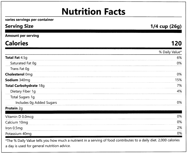 Corn, high oleic oil (contains one or more of the following: canola and/or safflower oil, salt, sugar, dehydrated vegetables (onion, tomato, garlic), spices, yeast extract, natural flavors, extractives of paprika, torula yeast, less than 2% silicon dioxide (added to prevent caking).