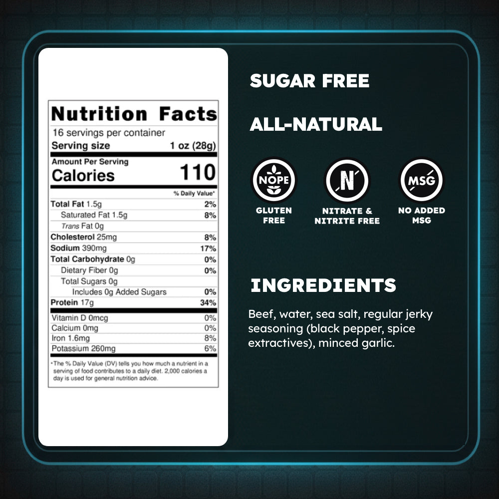 Garlic-lovers and vampire-phobes alike swear by our fresh-from-Texas Garlic flavor, which is enhanced by a rip-n-chew texture that melts in your mouth after 4 chomps (we tested it). Mesquite-smoked for 2 hours. The only change we made to this is removing the nitrites and replacing them with sea salt!